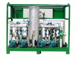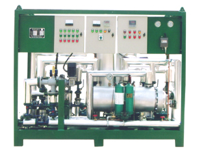 燃油供给系统主要用于供给船用柴油机燃油,并改善重质燃油的品质。系统将所需的设备组合成一个独立的装置,结构紧凑、连接可靠,安装调试、使用及维护方便,同时利于集中管理。 结构与工作原理 燃油供给系统由三通切换阀、粗滤器、供应泵、流量计、回油筒、循环泵、加热器、精滤器、粘度控制装置等组成。 日用油箱中的油通过三通切换阀进入粗滤器和供应泵,再进入流量计和回油筒,通过循环泵进入加热器加热,随后燃油进入自动粘度控制装置,当燃油的粘度不符合设定值时,粘度计发出信号,调节蒸汽阀的开启值,控制进入加热器的蒸汽量,使加热器的油温升高或降低,以保证系统出口燃油粘度符合要求。加热后的燃油进入并联的手动逆洗滤器和自动逆洗滤器,最后进入柴油机,通过喷油泵及调压阀,多余的油回到回油筒或日用重油箱。即使柴油机未工作,系统仍能实现燃油预热及重油、轻油快速切换。 本系统具用按柴油机要求供油及改善燃油器质的双重功能。 注:1、两台互为备用,出口装有压力开关,可实现压力低报警,出口压力设定为0.4MPa,避免燃油在回油筒内沸腾 2、使重质燃油的粘度下降,以满足柴油机的需求 3、过滤精度较高,可以有效改善重质燃油的品质 |
